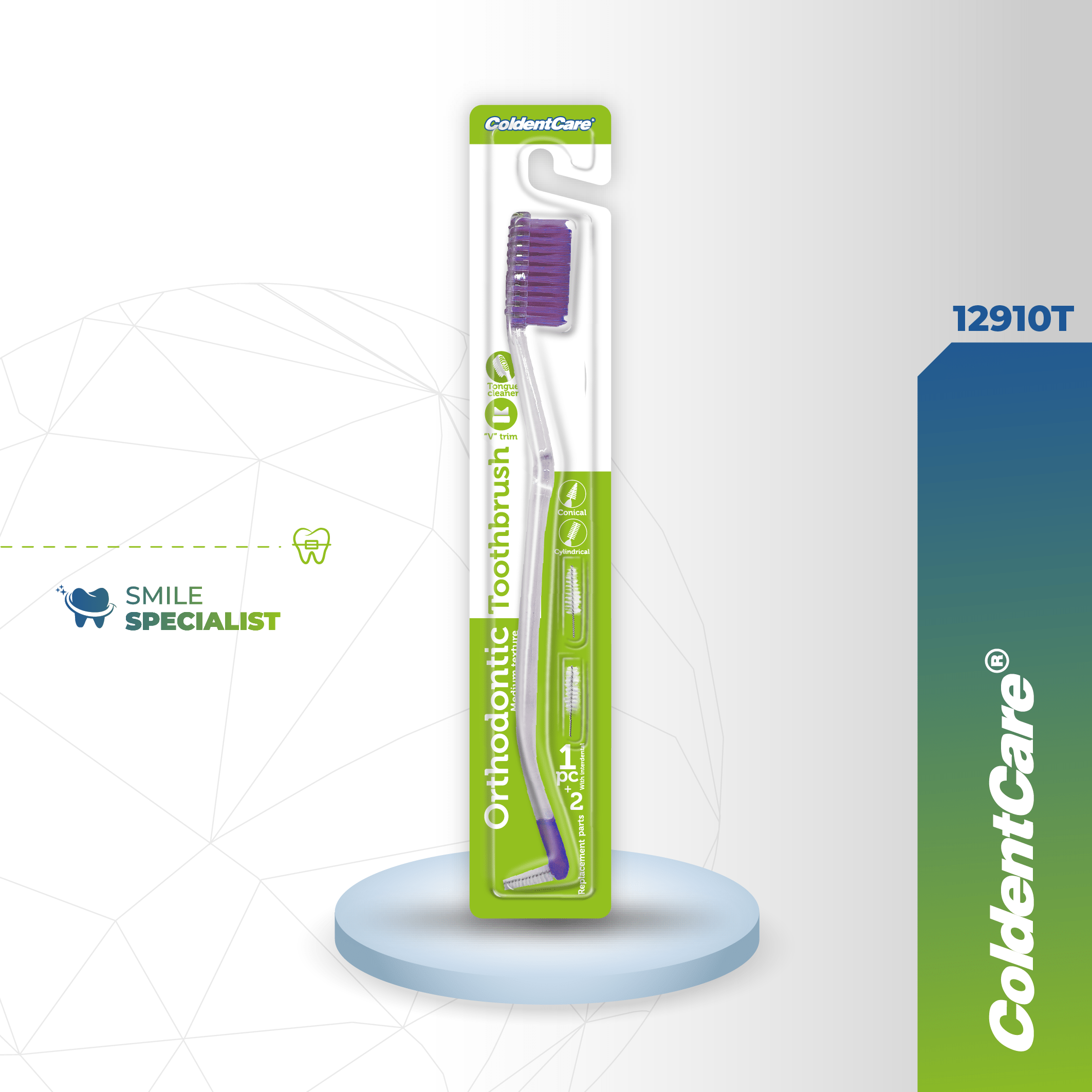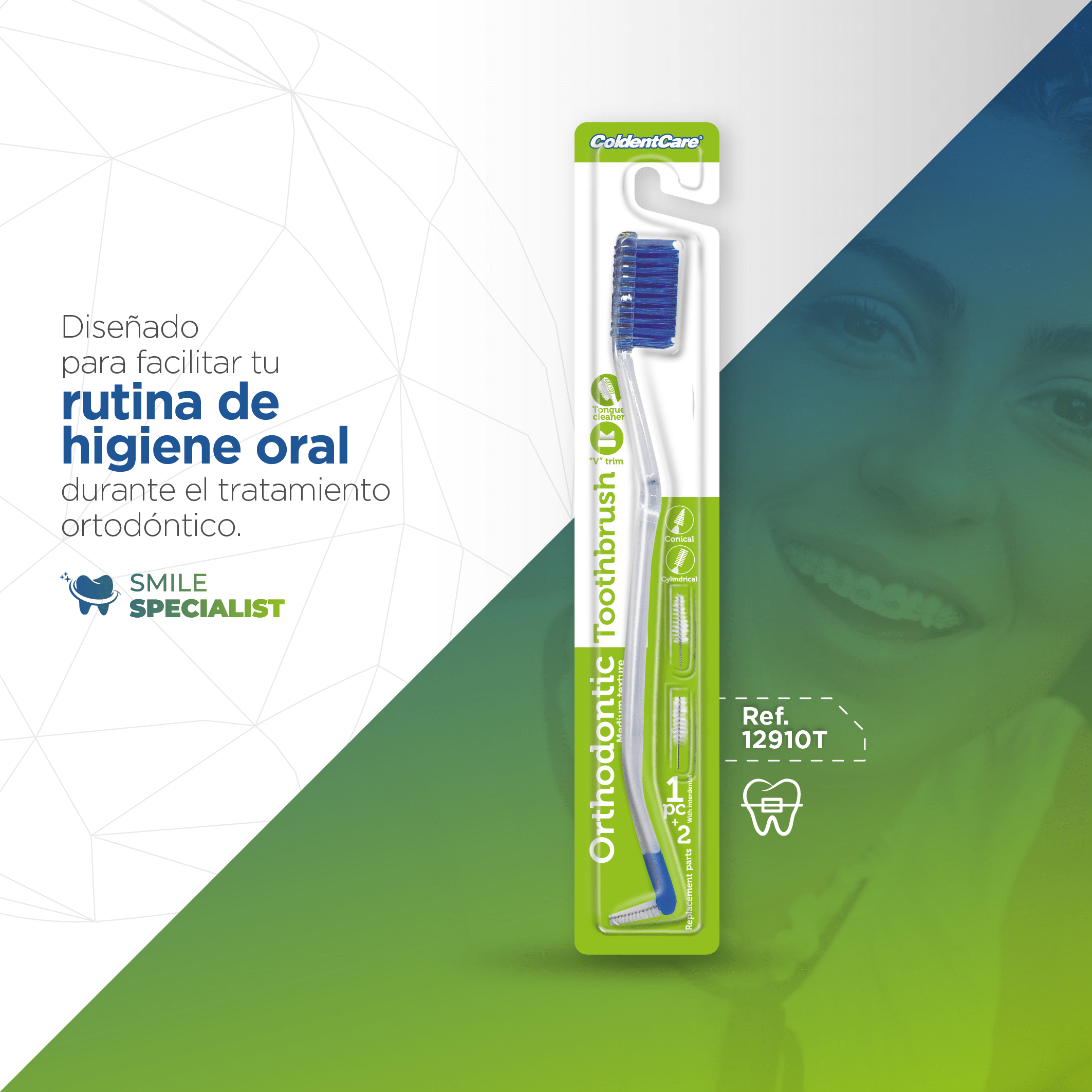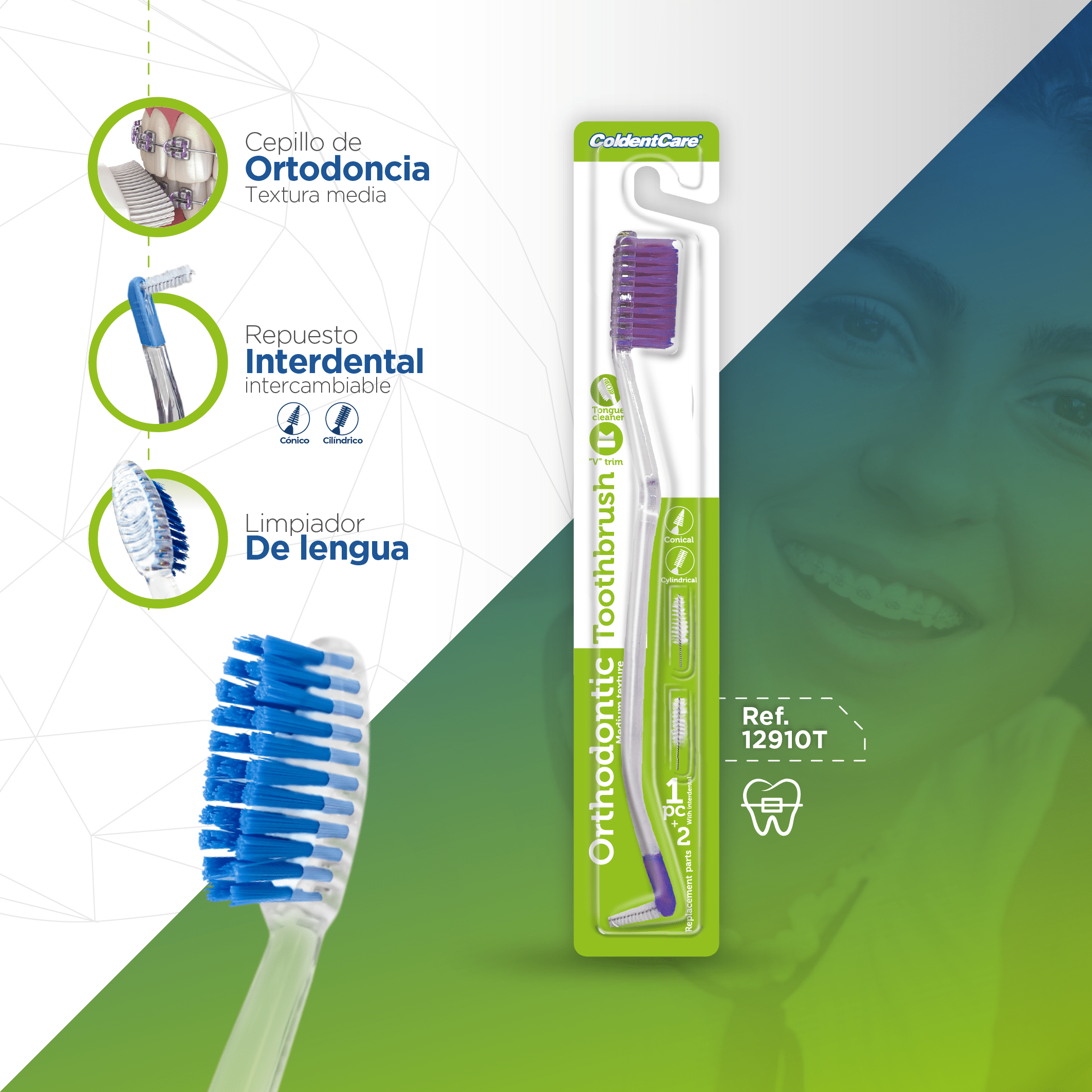 Especialmente diseñado para quienes usan aparatos de ortodoncia, el cepillo dental Doble extremo Coldentcare® ofrece una solución 2 en 1 para una higiene oral completa. En un extremo, cuenta con una cabeza ovalada con cerdas de textura media y corte en “V”, ideal para limpiar eficazmente alrededor de brackets y alambres. En el otro extremo, incorpora un cepillo interdental con sistema de acople para repuestos intercambiables (cónicos o cilíndricos), perfectos para acceder a espacios reducidos entre los dientes.