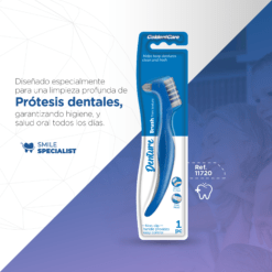 Nuestro cepillo dental para prótesis Coldentcare® Cuenta con filamentos firmes y cabezal doble que facilita la limpieza profunda de prótesis dentales, eliminando placa sin dañarlas. Cómodo y práctico para su cuidado diario.