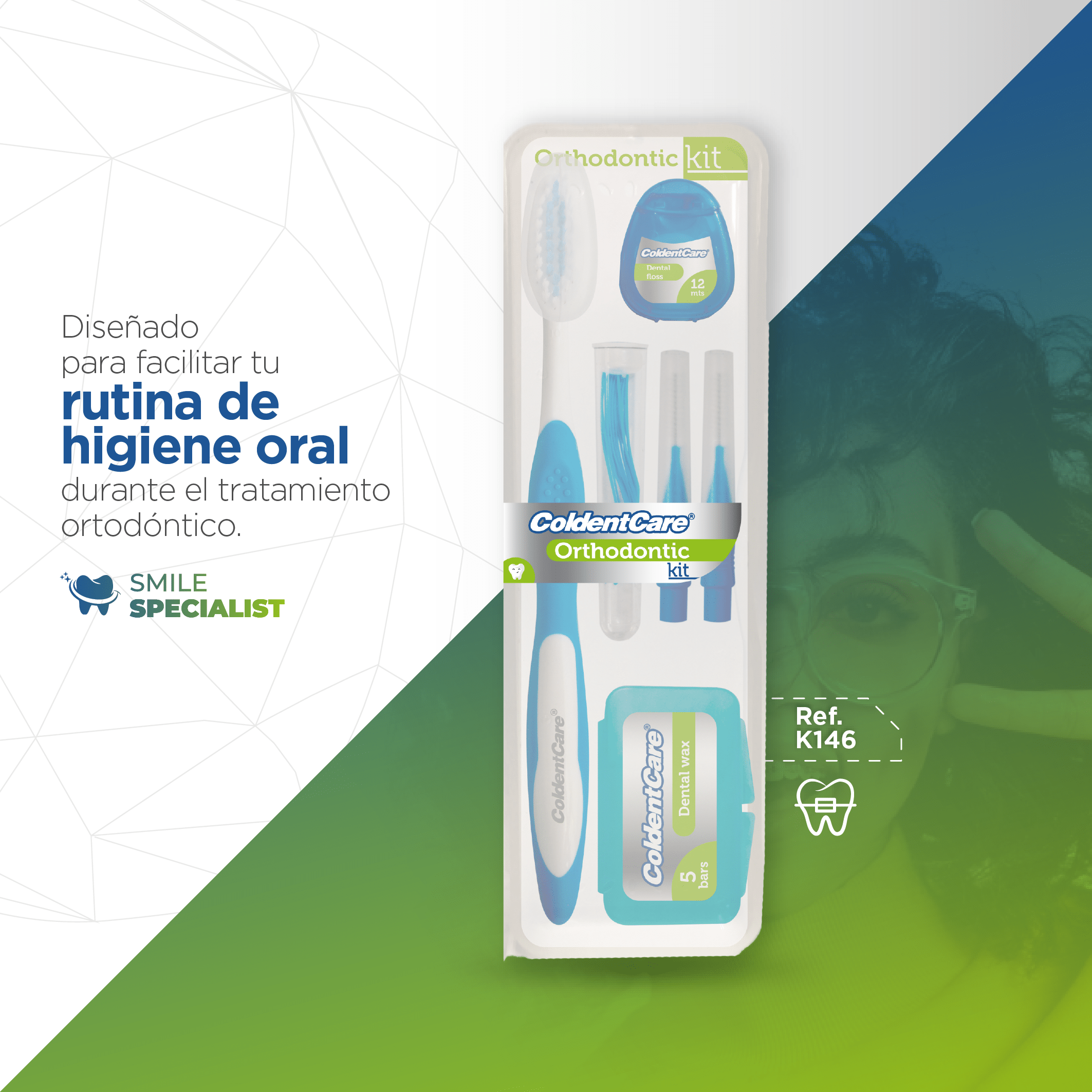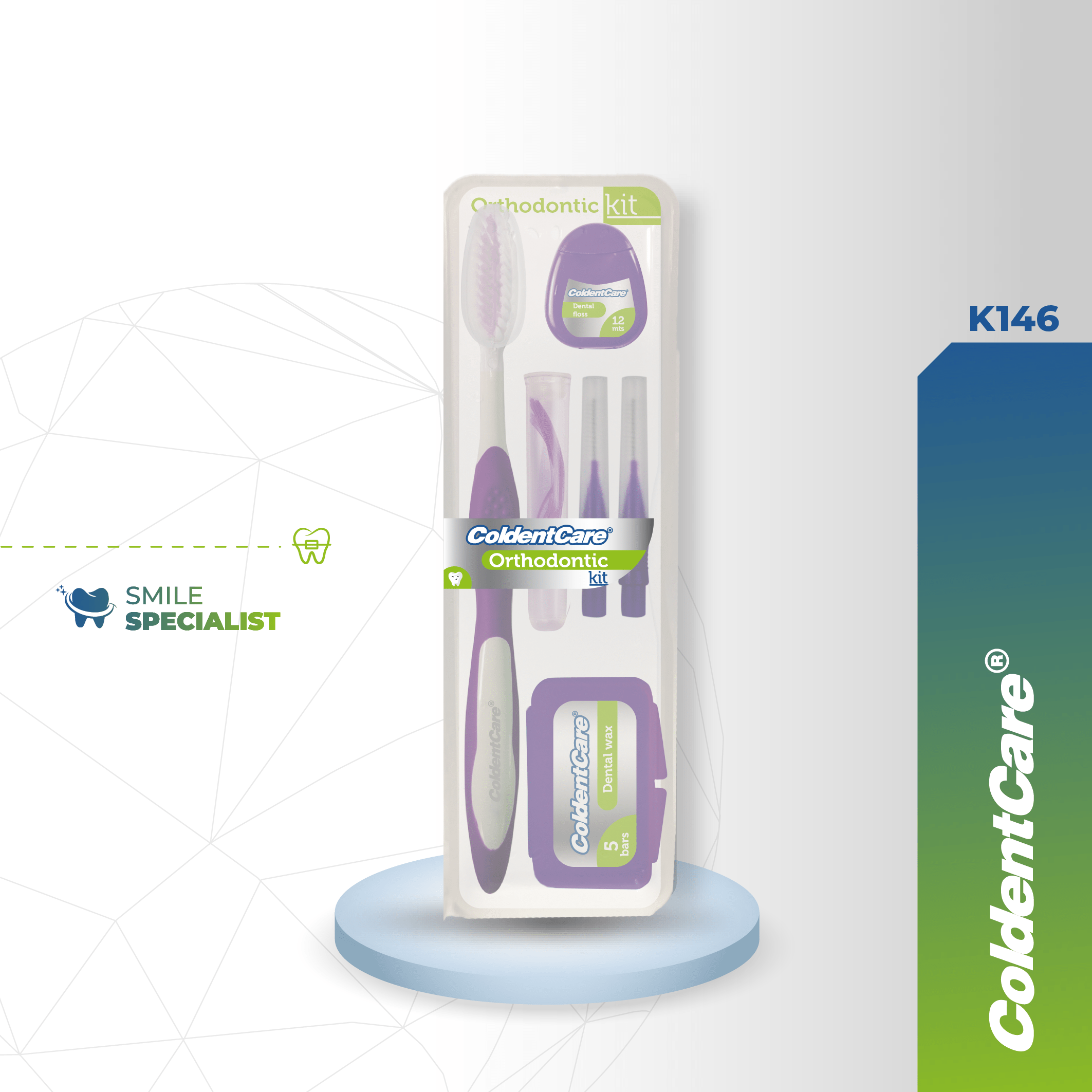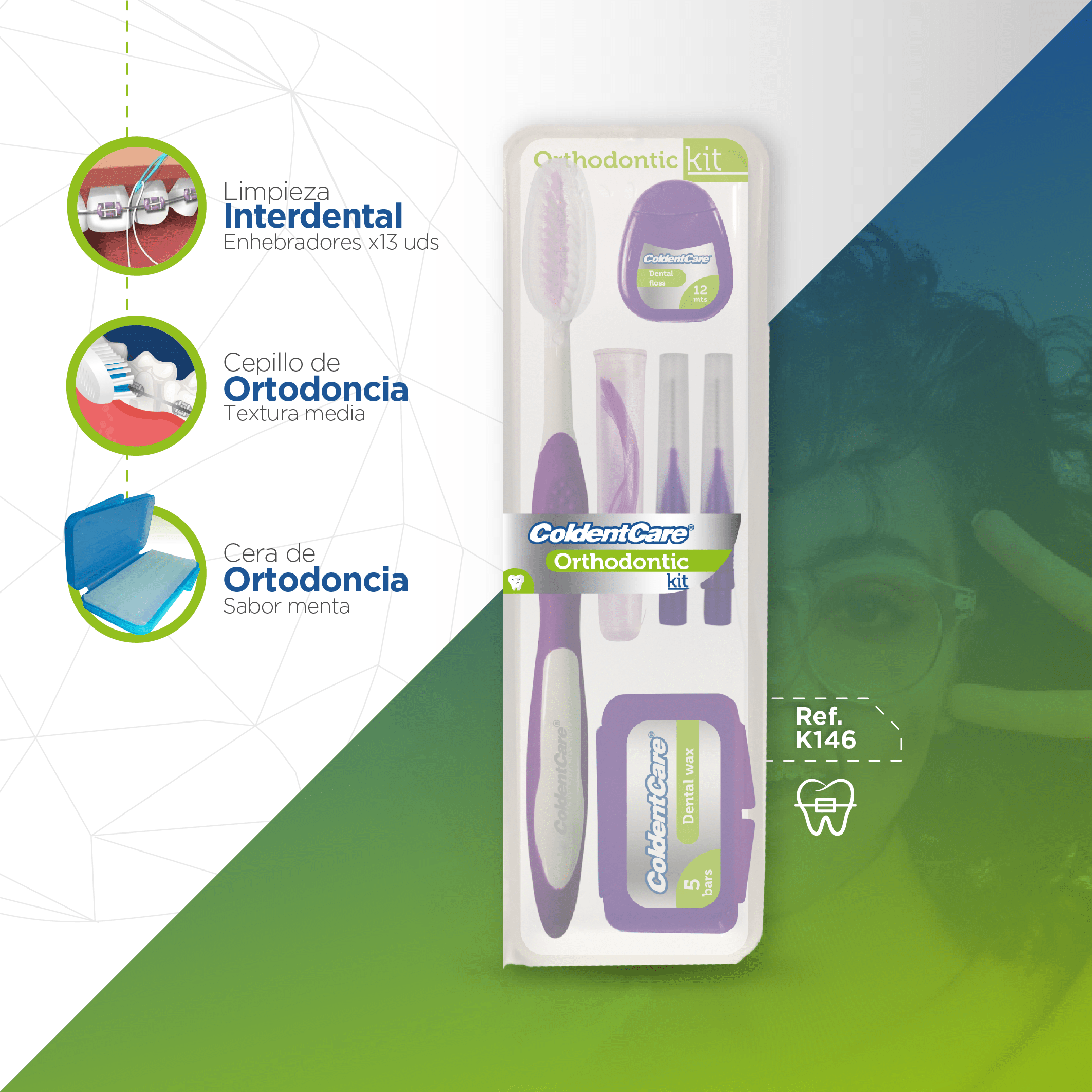 El kit K146 de ColdentCare® está especialmente diseñado para pacientes en tratamiento de ortodoncia. Incluye todos los implementos necesarios para una higiene oral adecuada durante el uso de aparatos, así como un inserto informativo con la descripción de cada elemento incluido en el kit.