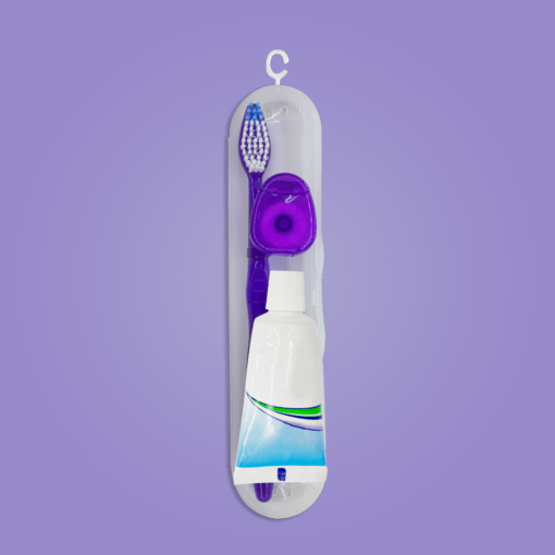 Práctico kit odontológico K119 portable que contiene cepillo, seda, crema dental para que puedas lavar y enjuagar tus dientes donde quieras. Incluye porta cepillo plástico.